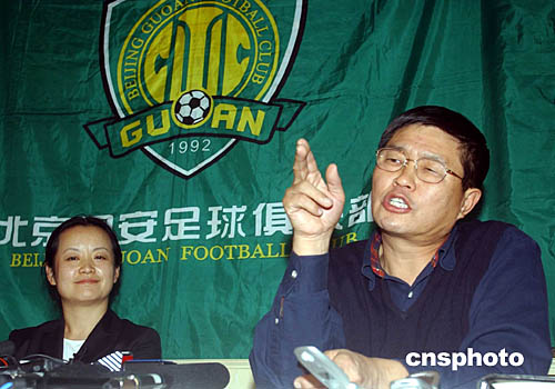 北京國安足球俱樂部有限責(zé)任公司首席律師王玉梅(左)在會(huì)上宣布國安正式啟動(dòng)向中國足協(xié)的申訴程序,總經(jīng)理?xiàng)钭嫖洌ㄓ遥┫蛎襟w傳達(dá)了俱樂部董事會(huì)決定用法律手段解決與中國足協(xié)矛盾的決心。