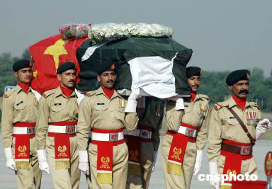 巴基斯坦禮兵抬著王鵬的靈柩走向?qū)C