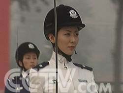 團體操剛剛演練完,他們馬上打散隊形,用倒功組成了“55、盾牌和長城”圖案,向國慶55周年和公安部建部55周年獻禮致敬。