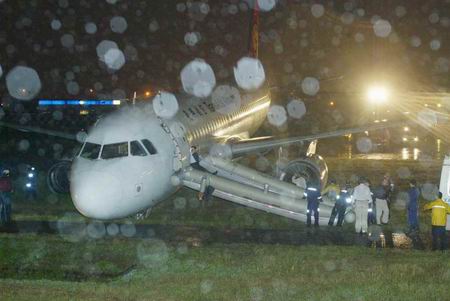 中新社臺北十月十九日電 (記者 張明新)臺灣復興航空一架由臺南飛往臺北的飛機昨天晚上在松山機場降落時,不慎滑出跑道,到目前為止,機場還未重開。