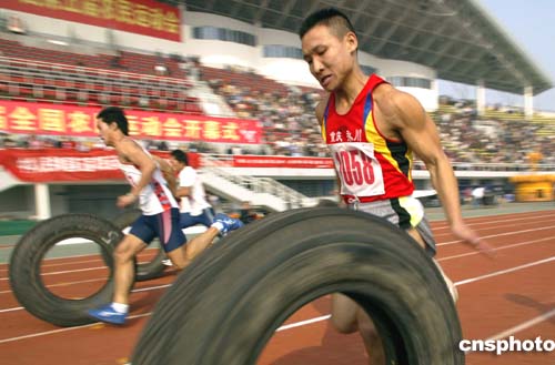 特色十足的一百米推輪胎比賽將速度與技巧結(jié)合在一起,成為賽場上的一個亮點(diǎn)。圖為參賽選手在男子一百米推輪胎比賽中奮勇爭先。中新社記者:盛佳鵬