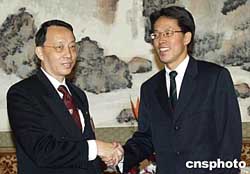 十月二十一日,國務(wù)院港澳辦副主任張曉明(右)在北京國賓館會(huì)見了由陳景生率領(lǐng)的香港大律師工會(huì)訪華團(tuán)。作者:史利