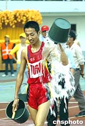 五分鐘五十米抗旱提水保苗賽跑成為一個特色的比賽項目,同時也是和農(nóng)民生活非常接近的一個比賽項目,要求參賽選手在規(guī)定的時間內(nèi)盡可能多的提水。圖為一位順利完成比賽的選手將水桶里的水倒在身上慶祝。作者:盛佳鵬