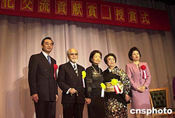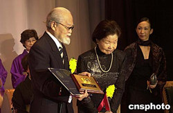 中國駐日本大使館二十五日舉行頒獎儀式,日本松山芭蕾舞團團長清水正夫、松山樹子和舞蹈家花柳千代等三位日本藝術(shù)界知名人士榮獲中國文化部頒發(fā)的“文化交流貢獻獎”。作者:王健