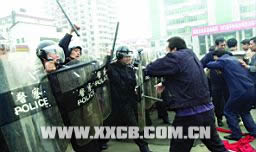 20余人聚集在某市市政府前“鬧事”,110民警迅速趕到現場設立警戒線,阻止“鬧事者”的前進。但情緒激動的“鬧事者”很快便沖破了第一道防線,開始毆打民警。接報趕到的防暴大隊特警手持防暴盾牌進行攔截,設置了第二道防線。為了迅速平息大規(guī)模的“騷亂事件”,上級命令使用催淚彈等對“鬧事人群”進行驅散。幾顆催淚彈丟在地上,散出滾滾濃煙。當特警采取防暴隊形圍捕了為首的“鬧事者”后,其余人便立即作鳥獸散去,“危機”終于化解。