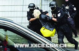 “我要裝滿油的汽車,把我送到安全地點!”“歹徒”用槍抵住“人質”的頭,跑上三樓,從窗戶內探出身子大叫:“不然我殺了他!”追捕小組一邊穩(wěn)定其情緒,一邊針對現場情況制定了強攻方案。3名特警從5樓貼墻緩緩而下,此時“歹徒”叫囂就要對“人質”下手,中間的特警看準時機,開槍擊斃了一名還在叫囂的“歹徒”。兩旁的特警乘機跳入房間,將另一名“歹徒”控制住。戰(zhàn)斗結束,“歹徒”一死一捕,“人質”被安全救出。