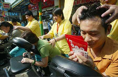 許多投注站都貼出“第100位樂(lè)透億萬(wàn)富翁”、“頭獎(jiǎng)獎(jiǎng)金上看6.5億元”的促銷海報(bào),還有投注站推出“買(mǎi)彩券送免費(fèi)按摩”的促銷活動(dòng)。