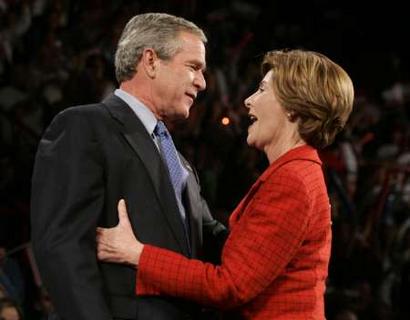 美共和黨候選人布什親吻第一夫人勞拉。 第一夫人勞拉為布什擦去遺留在臉上的口紅唇印。