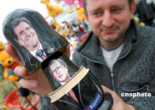 11月2日,美國總統(tǒng)大選開始正式投票。同日,遠(yuǎn)在歐洲的保加利亞,印有候選人布什和克里形象的“套娃”木偶玩具上市,銷售火爆。Ic/cnsphoto 攝