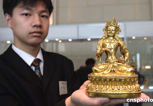 明代永樂(lè)年間的一尊銅鎏金金剛薩埵佛像以一百一十萬(wàn)元人民幣成交,遠(yuǎn)高于估價(jià)。該佛像用紅銅以失蠟術(shù)注澆而成,蓮座上鐫刻楷書陰識(shí)“大明永樂(lè)年施”,為明代宮廷造像,是當(dāng)時(shí)的中央政府賜贈(zèng)藏傳佛教高僧的禮物,被學(xué)術(shù)界稱為“永樂(lè)青銅塑像”。作者:張煒