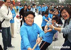 臺商子女黃文翰與同學們參加拔河比賽,家長在一邊加油。作者:潘索菲