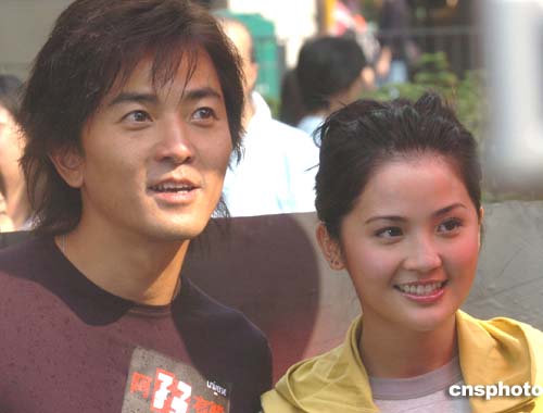 為配合電視劇《阿孖有難》的播出﹐在劇中擔任主要角色的鄭伊健和蔡卓妍6日在香港尖沙咀街頭造勢。作者:趙振清