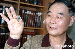 福建省收藏文化研究會名譽會長、福建錢幣收藏第一人欣士敏,十一月十日在福州首次向外界展示一枚清康熙二十七年(公元一六八八年)臺灣錢局鑄造發(fā)行的珍稀錢幣。這枚背面寫有滿、漢文“臺”字字樣的“康熙通寶”錢幣是三百多年前清政府統(tǒng)一臺灣、設(shè)置臺灣府的歷史見證。作者:劉可耕