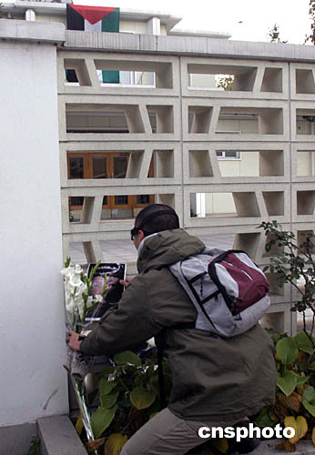 十一月十一日下午,由一些北京市民和學生自發(fā)敬獻的一簇簇鮮花擺放在巴勒斯坦國駐華使館門前,表達他們對巴勒斯坦國總統(tǒng)、巴民族權(quán)力機構(gòu)主席阿拉法特的哀悼。阿拉法特當天在法國巴黎病逝。中新社記者:張煒
