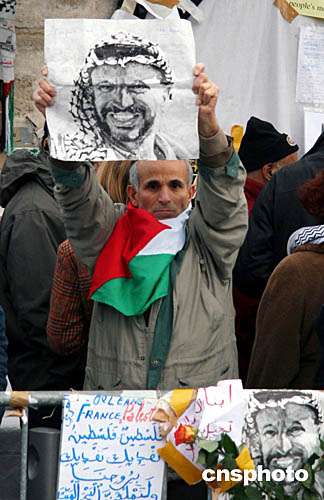 圖為10日傍晚趕到的敘利亞裔的哈桑,在守侯一整夜并得知阿拉法特去世的消息后,高舉畫像為自己心目中的英雄送行。