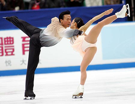 中國(guó)隊(duì)派出雙人滑第一組合、兩度世錦賽冠軍申雪/趙宏博出戰(zhàn),他們攜新編動(dòng)作在加拿大站大獎(jiǎng)賽上首演成功奪取冠軍。由于頭號(hào)種子俄羅斯選手托特米安妮娜/馬列寧的缺席,中國(guó)組合是參加本站比賽世界排名最高的運(yùn)動(dòng)員。今天的短節(jié)目比賽,申雪/趙宏博在九對(duì)選手中第六個(gè)出場(chǎng),盡管在做拋跳三周時(shí),申雪落地單手扶冰出現(xiàn)小失誤,但這并沒有影響他們之后的發(fā)揮,在《月光》悠揚(yáng)的樂(lè)曲聲中順利完成了八個(gè)規(guī)定動(dòng)作,以六十六點(diǎn)三八分位列第一。