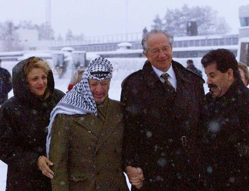 中新網(wǎng)11月12日電 1998年12月5日,阿拉法特訪問瑞典,與瑞典前首相安德森會(huì)面,左一為阿拉法特的妻子蘇哈。(春風(fēng))
