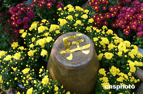 11月12日,臺(tái)北菊展在當(dāng)年蔣介石的士林官邸開(kāi)幕。圖為門(mén)前的“棋奕菊間”花區(qū),各色菊花間擺放著中國(guó)象棋棋子,創(chuàng)意十足。中新社記者:董會(huì)峰