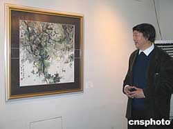 中國文聯(lián)副主席、天津市文聯(lián)主席馮驥才十一月十四日在天津舉辦公益畫展,義賣他今年創(chuàng)作的二十八幅畫,以支持正在中國各地進(jìn)行的舉步維艱的民間文化搶救事業(yè)。圖為馮驥才在公益畫展上向觀眾介紹他的作品。作者:孫志民