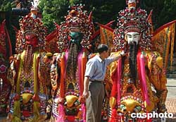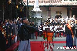 11月14日,“全臺大道公廟臺北大會師”系列活動在臺北舉行。圖為在臺北市大龍峒保安宮進行的三獻禮大典,計有二千人參加。大道公即保生大帝,早年自福建泉州分靈來臺。目前島內(nèi)各地以大道公為主神的廟宇約有二百座。作者:董會峰