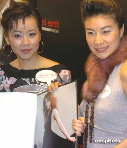 郭晶晶在現(xiàn)場(chǎng)接受化妝品公司高層贈(zèng)送的禮品。作者:趙振清