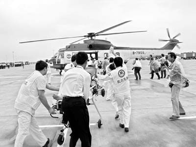 機(jī)場(chǎng)濃煙滾滾,兩輛消防車對(duì)準(zhǔn)飛機(jī)噴水,機(jī)組迅速打開艙門,施放緊急滑梯疏散旅客。機(jī)場(chǎng)醫(yī)療急救力量8輛救護(hù)車、60名擔(dān)架隊(duì)員也到達(dá)現(xiàn)場(chǎng),醫(yī)療人員根據(jù)受傷輕重分別在場(chǎng)地上不同區(qū)域插上紅、黃、綠、黑、白五色旗,擔(dān)架隊(duì)員抬著擔(dān)架沖向失事飛機(jī)迅速將傷員轉(zhuǎn)離飛機(jī),送往臨時(shí)搭建的醫(yī)療驗(yàn)傷區(qū)。