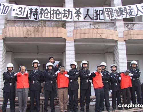 中新網重慶11月17日電(記者鄒輝)十月三十一日發(fā)生在重慶江北區(qū)盤溪蔬菜批發(fā)市場外的持槍搶劫殺人案成功告破,重慶警方今天下午對捉獲的四名犯罪嫌疑人進行了公開逮捕。警方稱,該案持槍犯罪嫌疑人胡某在拒捕時被擊傷,經醫(yī)院全力搶救無效已死亡。
