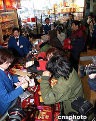 11月19日,數(shù)百名北京市民在菜百商場(chǎng)排隊(duì)購(gòu)買雞年賀歲金條。盡管黃金價(jià)格連年看漲,賀歲金條的價(jià)格由三年前的99元/克漲至今年的125元/克,仍未擋住北京市民的購(gòu)買熱情。中新社記者:史利