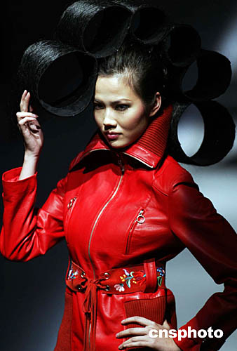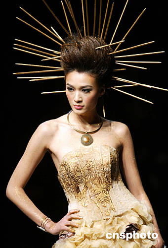 十一月二十三日,在中國國際時(shí)裝周會場北京飯店內(nèi),一場時(shí)裝發(fā)布會通過一組構(gòu)思奇特的模特造型將服裝設(shè)計(jì)師的時(shí)裝設(shè)計(jì)作品演繹得淋漓盡致,也更添模特嬌媚。中新社記者:盛佳鵬