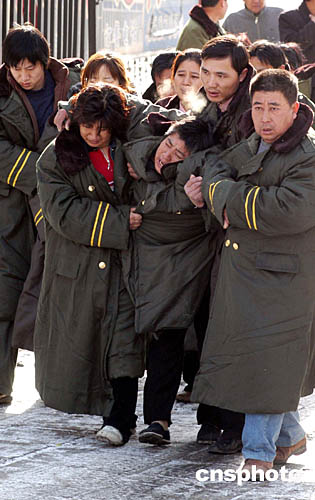 11月24日,包頭空難遇難者家屬踏雪前往飛機失事地點吊唁親人,返回時悲傷不已。中新社記者:張宇