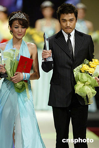 中國國際時(shí)裝周二零零四年度最佳職業(yè)模特獎(jiǎng)十一月二十五日晚在北京揭曉,胡兵(右)和韋杰獲此殊榮。中新社記者:盛佳鵬