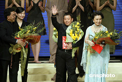中國國際時(shí)裝周第八屆中國時(shí)裝設(shè)計(jì)“金頂獎(jiǎng)”十一月二十五日晚在北京揭曉,“云敦至尊”品牌設(shè)計(jì)師計(jì)文波(中)摘得桂冠。中新社記者:盛佳鵬