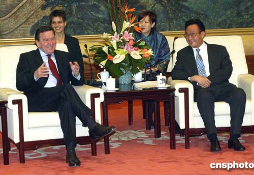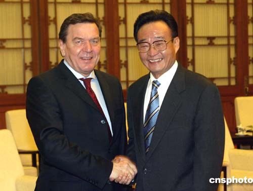 施羅德贊同吳邦國對德中關系的評價。他說,中德關系建立在相互信任的基礎上,各個方面的合作都很好。德國政府重視德中關系,將繼續(xù)堅持一個中國政策。德方愿進一步加強兩國議會業(yè)已存在的良好合作關系。同時,愿繼續(xù)加強與中國的民間交往,以及文化交流。德方愿與中方一道使德中關系始終保持高水平的發(fā)展。
