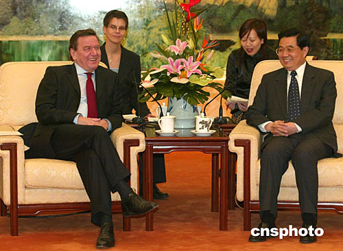 胡錦濤是今天下午在人民大會堂會見德國總理施羅德時作上述表示的。