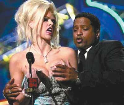 VH1音樂頻道2004頒獎晚會日前在洛杉磯舉行,安娜·尼科爾·史密斯也應邀參加,不知為何,當她走到舞臺上后,突然脫去了裙子,露出了自己的雙乳,及時趕到的保安用手盡量遮擋住她的乳房,強行將她拉到了后臺。據(jù)一位觀眾說:“當時,史密斯看起來非常興奮,就在她脫裙子的一瞬間,一名保安把她拉到了后臺!笨墒,到了后臺后史密斯仍然不老實,她甚至想讓攝影師給她拍裸照。前不久,史密斯在參加美國音樂頒獎晚會時,也因精神恍惚、吐字不清令觀眾無法聽懂她在說什么,還一度趴在臺上睡覺,結果主持人打斷了她的講話,將她請下舞臺。有消息說,她當時要么是喝醉了,要么就是受到了吸毒的影響,但她的律師解釋說,由于這位名模的視力不太好,所以無法看清自動提詞機上的文字。