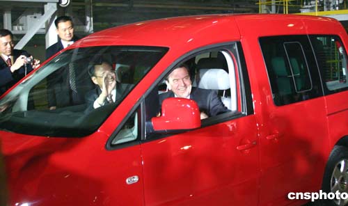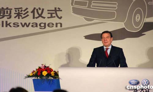 二00四年十二月七日,正在吉林省長(zhǎng)春市進(jìn)行參觀訪問(wèn)的德國(guó)總理施羅德,在中國(guó)副總理曾培炎陪同下,為當(dāng)日正式建成投產(chǎn)的中德合作項(xiàng)目大眾汽車有限公司轎車二廠剪彩。