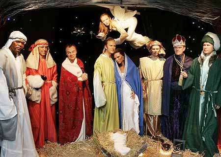 倫敦蠟像館重構(gòu)的耶穌誕生場(chǎng)景中,貝克漢姆及維多莉亞居中,站在耶穌身後,身邊尚有貌似英國(guó)首相布萊爾、菲臘親王及美國(guó)總統(tǒng)布什的東方三博士,而貌似好萊塢影星格蘭特、山姆杰克遜及清談節(jié)目名主持格雷姆諾頓的牧羊人。向以性感著稱的澳洲歌星Kylie Minogue,則成了貝克漢姆夫婦頭頂上飛舞的天使。