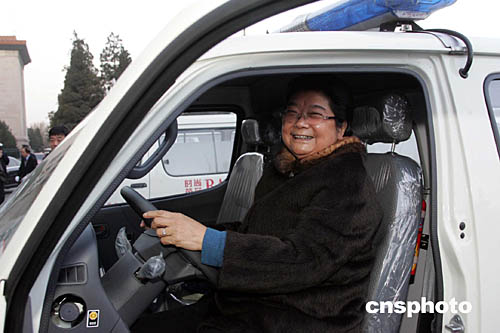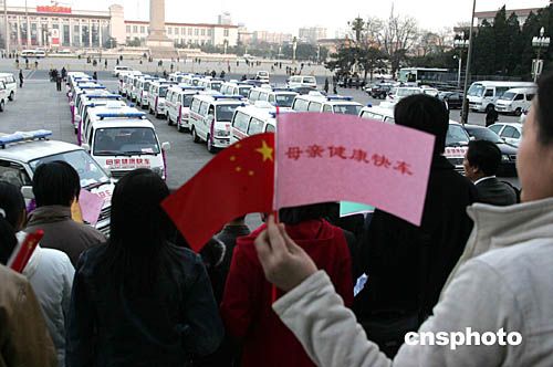 由全國(guó)婦聯(lián)、國(guó)務(wù)院婦女兒童工作委員會(huì)主辦的大型公益項(xiàng)目--“母親健康快車(chē)”發(fā)車(chē)儀式十二月十日在北京人民大會(huì)堂舉行,五十多輛滿載社會(huì)各界愛(ài)心人士祝福和希望的“母親健康快車(chē)”從天安門(mén)廣場(chǎng)出發(fā),分別開(kāi)往甘肅、青海、陜西等省為西部貧困母親開(kāi)展衛(wèi)生健康服務(wù)。全國(guó)人大常委會(huì)副委員長(zhǎng)、全國(guó)婦聯(lián)主席顧秀蓮出席發(fā)車(chē)儀式,并親自參觀、乘坐“母親健康快車(chē)”。中新社記者:毛建軍
