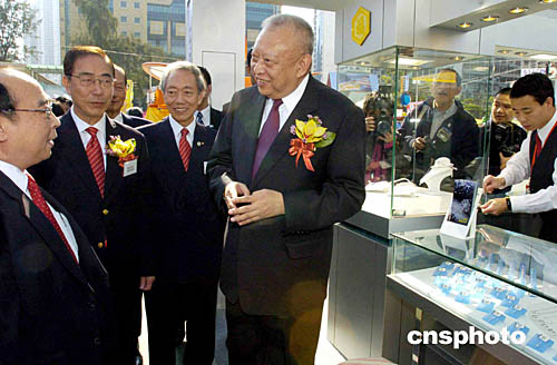 香港特區(qū)行政長官董建華,12月11日在維園主持“第三十九屆工展會”開幕典禮,隨后興致勃勃的參觀會場。圖為董建華在中華廠商聯合會長楊孫西等陪同下了解珠寶業(yè)在內地發(fā)展業(yè)務的情況。