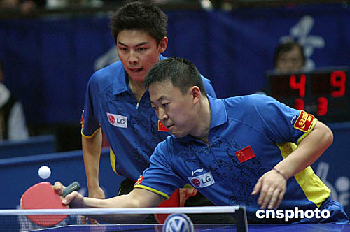十二月十一日,在北京舉行的二零零四年國(guó)際乒聯(lián)巡回賽總決賽結(jié)束了男雙半決賽的比賽,中國(guó)選手馬琳和陳杞輕松擊敗對(duì)手進(jìn)軍決賽。圖為馬琳、陳杞在比賽中。中新社記者:盛佳鵬
