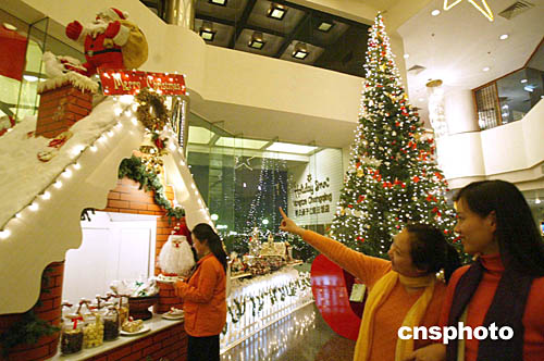 十二月十三日,幾名重慶女孩被裝飾精美的圣誕樹和冰雪小屋所吸引。圣誕臨近,重慶各大商場、酒店紛紛裝點(diǎn)出濃郁的圣誕氣氛。作者:郭晉嘉