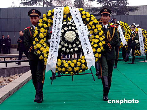 圖為各界人士在安魂曲的凄婉中向遇難同胞敬獻花圈。