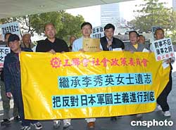 日本軍國主義在中國南京大屠殺67周年之際,香港工會聯(lián)合會社會政策委員會成員13日在香港的日本駐香港領(lǐng)事館前舉行游行,聲討日本軍國主義的罪行,為遇難者哀悼。作者:趙振清