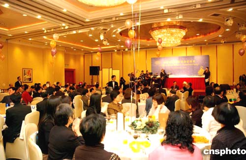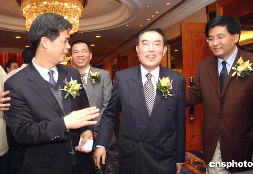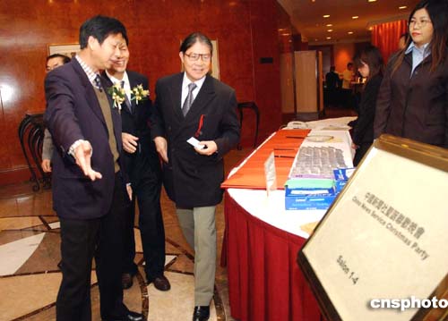 圖為中國新聞社總編輯郭招金[左]迎接中聯(lián)辦副主任王鳳超[中]蒞臨晚宴。作者:洪少葵