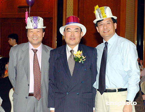 中聯(lián)辦副主任王鳳超[中]、中新社香港分社社長章新新、香港文匯報(bào)社長張國良[左]在晚宴上。作者:宋吉河