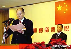 全國(guó)政協(xié)副主席、澳門中華總商會(huì)會(huì)長(zhǎng)馬萬祺,16日在澳門中華總商會(huì)慶祝澳門特別行政區(qū)成立五周年酒會(huì)上致辭,澳門特別行政區(qū)行政長(zhǎng)官何厚鏵參加酒會(huì)。作者:宋吉河