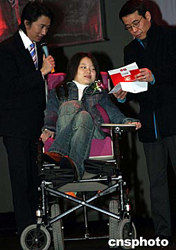 中國數(shù)字原創(chuàng)盛會“英特爾·二零零四年度中國數(shù)字盛典”頒獎典禮活動十二月十六日晚在北京舉行,各方代表、明星嘉賓和十五名Diggi數(shù)字原創(chuàng)大獎獲得者與會。據(jù)悉,本次比賽開創(chuàng)五項之最,即最大規(guī)模、最廣泛影響力、最權(quán)威、最娛樂、最高獎金額,共收到參賽作品近一萬五千份。圖為用嘴創(chuàng)作FLASH作品、享譽網(wǎng)絡(luò)世界的閃客田甜(中)在頒獎典禮上擔(dān)任開獎和頒獎嘉賓。中新社記者:盛佳鵬