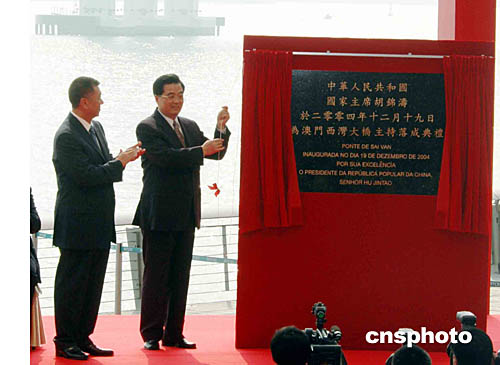 中新社澳門(mén)十二月十九日電 題:胡錦濤為澳門(mén)西灣大橋剪彩