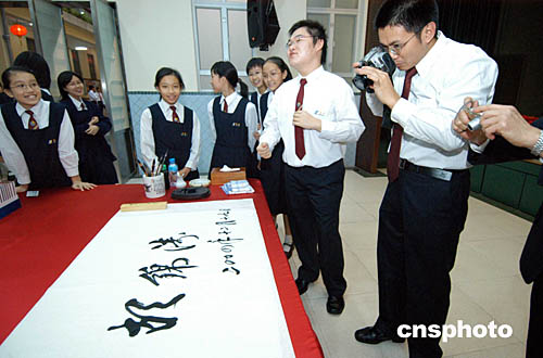 國家主席胡錦濤在參觀澳門勞工子弟學(xué)校時(shí)寫下了“胡錦濤”三字墨寶,引來學(xué)生爭相拍攝。