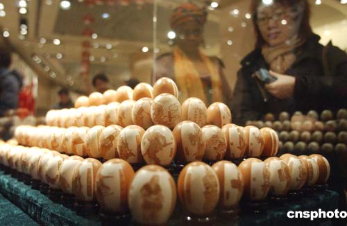 十二月二十六日,中外游人正在觀看用雞蛋殼雕刻出的《水滸》人物“一百單八將”。二十四日,北京民間藝術(shù)展開(kāi)始在中華世紀(jì)壇舉行,同時(shí)展出的還有風(fēng)箏、泥塑、面塑、毛猴、剪紙、蛋雕、京劇臉譜等二十多個(gè)藝術(shù)門類的二百八十件民間工藝品。作者:韓藝冰